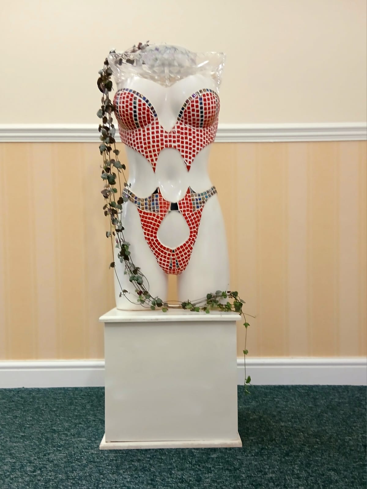 I am 77 years old and create art of various mediums. I started creating 3D Manequin mosaics during lockdown. I built small plinths to sit them and added a small glass tray to recycle as hall table