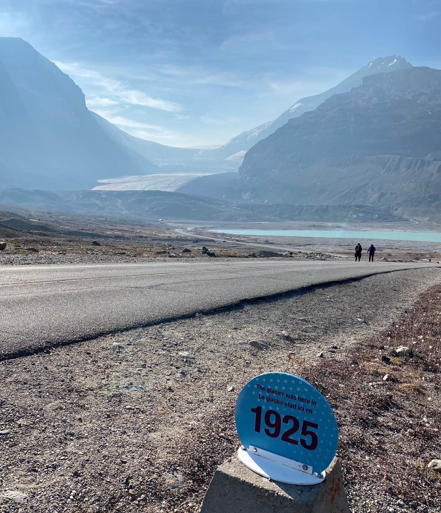 100 years of a shrinking glacier in Canada. The marker shows where it reached in 1925 and it can be seen in the distance.
